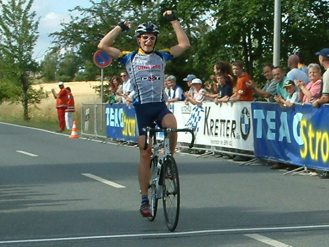 Andre Greipel rettete die Ehre für das TEAG Team Köstritzer, als er beim Zielspurt die Führung der Verfolger übernahm und mit Rang drei sich einen Platz auf dem Siegerpodest sicherte. Die schnelleren Beine hatte Robert Retschke, der sich anderthalb Runden vor dem Zielstrich gemeinsam mit seinem Sportkameraden aus dem Team Vermarc Sportswear, Steffen Lockan, absetzen konnte, aber als Profi der UCI Kategorie III in der U23 außerhalb der Konkurrenz als Einzelfahrer am Start war. Der Mann in Gelb, Moritz Veit, in der Tageswertung auf Rang 21, konnte seine Führung gegenüber dem auf Rang zwei nachrückenden Linus Gerdemann (Techem) weiter ausbauen und auch im Gesamtklassement der Teams hat das TEAG Team Köstritzer weiter die Nase vorn. Von den 119 Fahrern blieben nach 148,5 km 33 auf der Strecke. Alle sechs vom SSV Gera bewiesen Stehvermögen und kamen auf die weiteren Plätze: 22. Falk Dworatzek, 31. Robert Wagner, 55. Sebastian Paddags, 77. Daniel Schlegel.03.08.2003 - www.ssv-gera.de