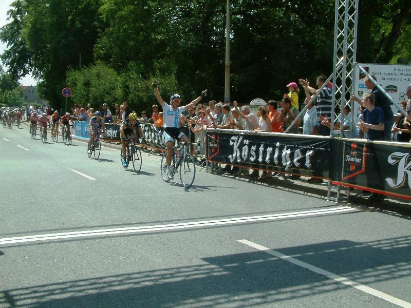 Die extrem sommerlichen Temperaturen, Rennverlauf und Streckenprofil schienen Christian Kux zu beflügeln, der gewissermaßen zu Hause zeigen wollte wie stark sein Team tatsächlich ist. Im Massenspurt nach 171,60 km setzte sich der 21-jährige Chemnitzer gegen Dennis Pohl (Team Heinz von Heiden) und Michael Franzl (Team Mapei-Heizomat) durch. Selbst die kleinen Anstiege und engen Durchfahrten meisterte der Bahnspezialist, der schon beim Bundesligasauftakt in Cadolzburg brillierte. Vielleicht ein gutes Ohmen, Sieg zum Auftakt, Triumph zur Halbzeit der Rennserie, kommt dann möglicherweise der Gesamtsieg im Einzelklassement. „Über einen möglichen Gesamtsieg will ich jetzt noch nicht sprechen. Immerhin liegen ja noch vier Renntage vor mir“, zeigt sich Christian Kux bescheiden, der seinem Team auf den 13,2 km Rundkurs, der 13 Mal umfahren werden musste, ein großes Lob zollte. Ein Lob was auch von der Teamleitung kam.