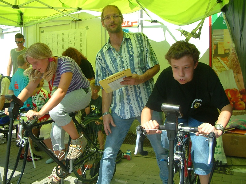 Förderkreis Radsport Gera e.V. ein umfangreiches Rahmenprogramm. Dazu zählten ein Geschicklichkeitsfahren, Sprintläufe, Ergometertest und ein Wissensquiz. Kräftig in die Pedalen traten auch Schüler aus Ronneburg, wie der 6-jährige Nico Ender oder Katja Ender und Christian Kloss, beide 14 Jahre, die in einer Minute 560 m zurücklegten. Eine Kostprobe ihres Könnens gab die Tanzgruppe des ASC Ronneburg.