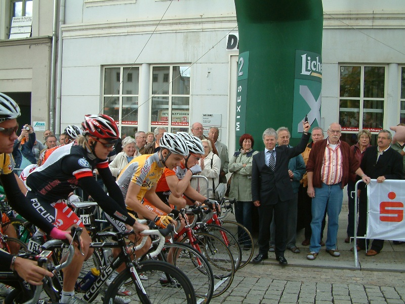 Punkt 12 Uhr gab Geras Oberbürgermeister Dr. Norbert Vornehm am Mittwoch den Startschuss für die 94 Fahrer aus 16 Teams, die bis zum Ziel in Bad Dürrheim am Sonntag auf ihren fünf Etappen über 700 km zurücklegen werden.