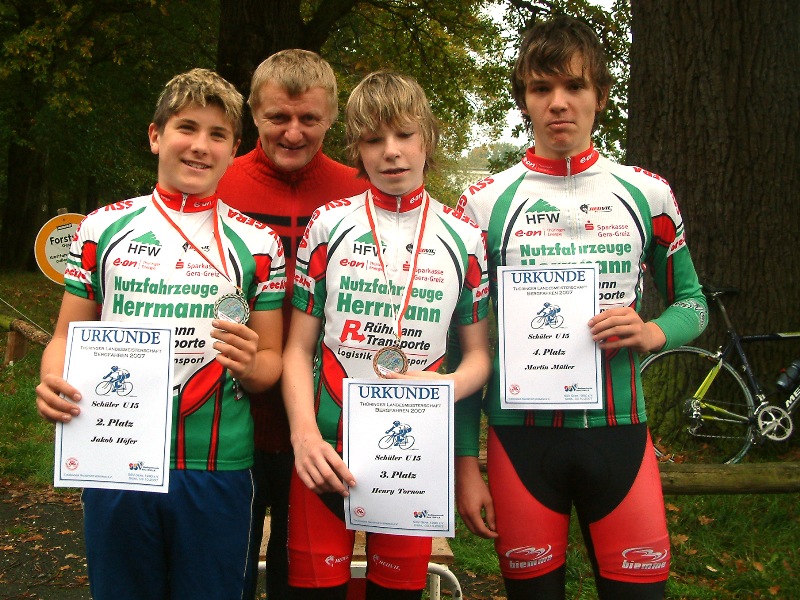 Die anspruchsvollen 2,1 km im Geraer Stadtwald, vorbei am Schloss Osterstein und Jagdhof bis Ernsee, meisterten für den SSV Gera am besten Benjamin Braut in der Juniorenklasse und Danilo Kupfernagel im Trikot des Continental Team Milram bei den Männern. Die Greizer Titel erkämpften sich in der U13 Florian Butz und bei den Juniorinnen Anne Luise Zeitz. Gold gab es in der U13w für Franziska Banzer vom Jenaer RV und bei den Senioren für den Starter vom RC Gera 92 Heiko Grünelt aus dem Masters-Team DKV Neff. 05.10.2007 - www.ssv-gera.de