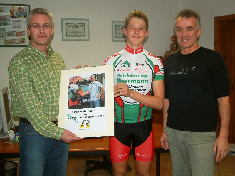 JWM-Teilnehmer, Drittplatzierter der Deutschen Meisterschaft im Einzelzeitfahren und Achtplatzierter in der Junioren Radbundesliga aus dem H&R race Team, Florian Harbig vom SSV Gera 1990 bedankte sich mit einem Ehrenpräsent bei Mario Zepezauer vom LVM Servicebüro in der Geraer Wiesestraße für die Unterstützung in der Saison 2007. 12.12.2007 - www.ssv-gera.de