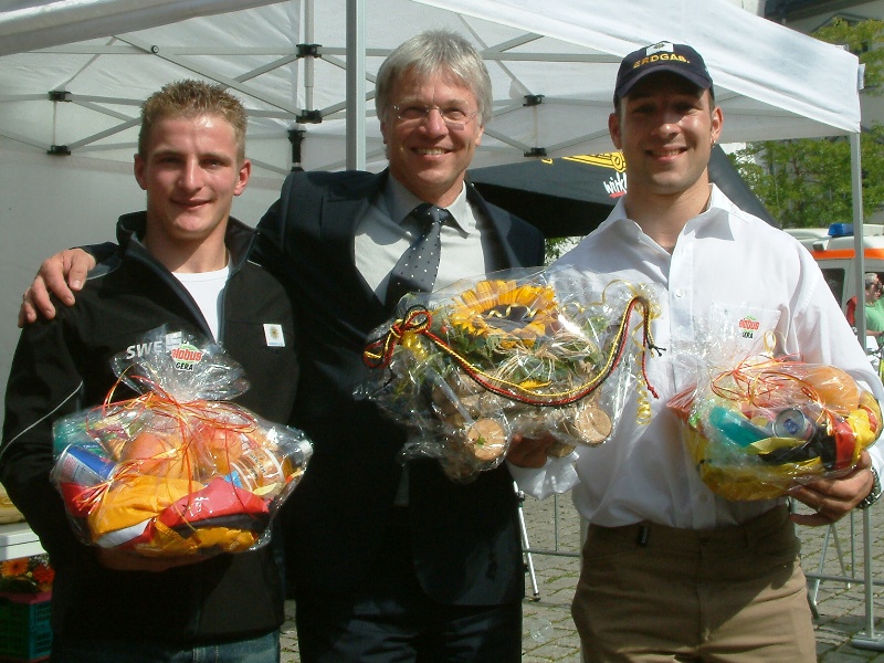 Doch bevor der Rathauschef mit Worten in Fahrt kam, fiel Rundfahrtsprecher Dirk Lunk dem Kommunalpolitiker ins Wort, denn die Radamazonen hatten es eilig und das Peloton setzte früher als geplant zum Spurt bei der ersten Zieldurchfahrt an. Zuvor gab es für die Olympiadebütanten ein Ehrengeschenk. Unter den Gästen auch Klaus Bertel von der Firma Breckle, die speziell Robert Förstemann auf seinem Weg nach Peking großzügig unterstützen. "Wir glauben fest an Robert und drücken ihm die Daumen, dass er in Peking zum Einsatz kommt. Doch egal wie, wir werden ihn weiter unterstützen", versichert Klaus Bertel.
