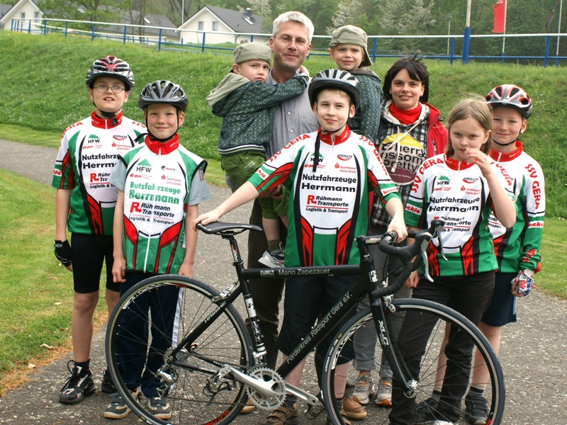 Ganz in Familie war Mario Zepezauer von der LVM Versicherung kürzlich auf die Radrennbahn gekommen. Er schaute aber nicht nur den Anfängern beim Training zu, sondern er hatte auch etwas mitgebracht. Seit längerem fördert er den SSV-Radsport und diesmal hat er für die Jüngsten ein Rennrad mitgebracht. "Wir freuen uns über jedes Kind, das den Weg zur Radrennbahn findet. Das Problem ist nur, uns werden die Rennräder knapp. Da kommt uns die Unterstützung durch Mario Zepezauer gerade recht", verrät Melanie Lenk, die beim SSV Gera 1990 die Anfänger sportlich betreut. Initiiert wurde diese Unterstützung durch den Förderkreis Radsport Gera e.V. 30.04.2009 - www.ssv-gera.de