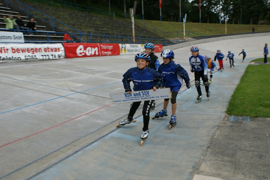 Dass der Geraer Sport eine Familie ist, diese Erfahrung machten die Radsportler bei ihrer Veranstaltung am 3. Juni. Sportler anderer Vereine waren mit ihren Trainern und Vorstandsvertretern gekommen, um ihre Solidarität zu beweisen. Die jungen Fußballer vom 1. FC 03 wie auch die Schwimmer scheuten sich nicht und drehten mit dem Rennrad einige Runden auf dem 250 m Betonoval und die Speedskater schossen auf ihren Rollen mit Transparenten "RSV und SSV zusammen für eine sportliche Zukunft in Gera" und "Roll- und Radsport für Geras Kinder" über die Bahn.