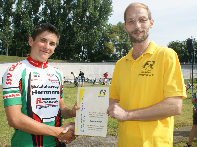 Die Entscheidung im Gremium des Förderkreis Radsport Gera, wer zum Sportler des Monats Juni gekürt wird, war längst gefallen, doch traditionell sollte die Ehrung vor heimischem Publikum vorgenommen werden und dafür bot der 5.Lauf zum "eropräzisa" Nachwuchs-BahnCup am Samstag die ideale Bühne, vor allem auch, weil diesmal das Wetter voll mitspielte. Die Ehrenurkunde überreichte Förderkreismitglied Jens Wenzel an Jakob Höfer.
